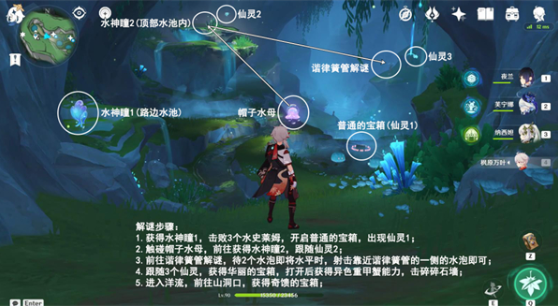 6、完成机关解谜后,密切跟随场景内三个游动仙灵的移动轨迹。当仙灵归位后,立即执行下潜指令进入隐藏水域,此处可解锁珍贵华丽宝箱。